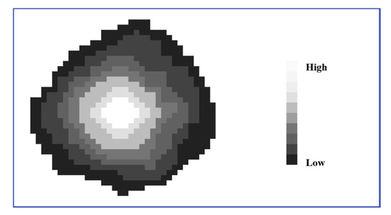 The identified treetops were used as seeds in a modified SRG algorithm to produce the final segments of the ITCs. The traditional SRG method was improved in the following ways: (1) a contextual merging criterion was proposed based on neutrosophic logic and (2) a constraint based on the shape of the crown was imposed during the merging process. Starting from the identified treetops, the procedures were carried out iteratively until all of the pixels were merged into a region with a treetop. As described in Section 2.2.1, the identified treetops were regions. At each iteration and for a given treetop region, all of its connected pixels were first evaluated based on the merging criterion defined based on neutrosophic logic, and for those pixels satisfied the merging criterion, an additional condition were checked. The additional condition was based on the assumption that the shape of a crown could be described by a Gaussian function. As a result, these candidate pixels for merging were examined to determine whether or not the crown shape by adding them conformed to the Gaussian template described in Equation (1). The morphology of tree crowns has been extensively examined in template-based ITC delineation studies [11,12] and Gaussian functions have been a popular choice for templates as they are not only fast to compute but also adaptable to the morphologies of different tree species.