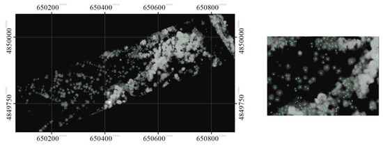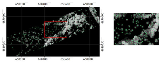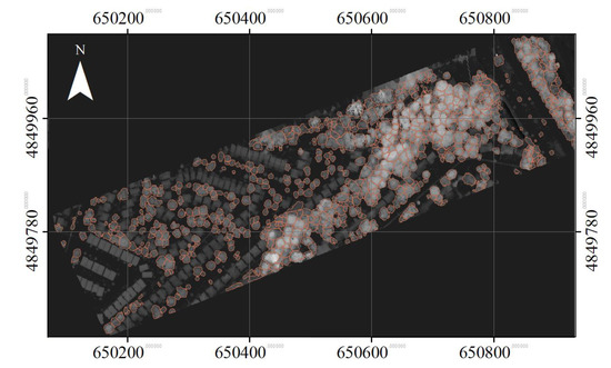 To evaluate quantitatively the segment results, manual delineation was independently carried out on the LiDAR data. A total of 718 trees (hereafter referred to as “reference crowns”) were identified, as shown in Figure 8. The overlap of each reference crown with individual segments was calculated based on Equation (10). It was assigned to one of the following categories [12,32,33,34]: (1) matched, if its overlap with a segment was over 50%; (2) partially matched, if the overlap was less than 50% but greater than 25%; and (3) omitted, if the overlap with any segment was less than 25%. Overlap was determined as follows:
