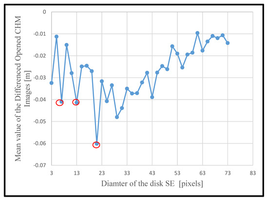 To determine the dominant crown sizes in the scene, the morphological operations described earlier were applied to the CHM for channel 1. The results are shown in Figure 9. Several minima were observed, and those corresponding to the predominant crown sizes are marked with red circles. The first minimum, which corresponded to the diameter of the SE of three pixels, was interpreted as upper tree branches and thus was excluded from the analysis. Local minima beyond the diameter of 21 pixels were subdued and hence were interpreted as tree clusters in the scene. Scale sizes of 7, 13, and 21 pixels were identified as representing the predominant small, medium, and large crown sizes in the scene. The effect of the selection of the range of the scale sizes on the results is further discussed in the discussion section. The identified scales were used to generate morphologically opened CHM images, and local maxima were identified as treetops in the opened images.