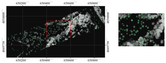 The identified local maxima (treetops), overlaid on the masked CHM, in the opened image with a disk SE with diameter of 21 pixels. A zoomed area is also shown here.