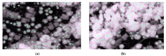 The treetops identified by the proposed multi-scale treetop detection method for the two zoomed areas (shown in Figure 13) representing typical street (a) and woodlot (b) trees.