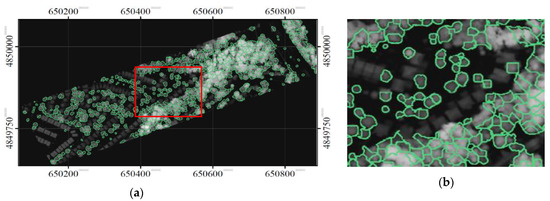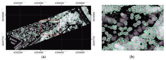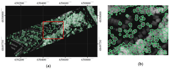 The delineated segments using the proposed method (“the neutrosophic method with intensities and CHM”). The intensity data were used to perform the segmentation using the neutrosophic logic and the CHM was used to enforce the LiDAR shape constraint. (a) the whole study area and (b) a focused area.