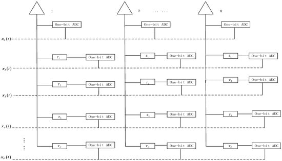 where denotes the response entity of the m-th sensor with respect to the k-th signal, represents the speed of light, represents the k-th incident far-field narrowband signal, and are the DOA and carrier frequency of the k-th signal. denotes the noise signal of the m-th sensor. Then the received signal is sampled using a one-bit ADC, i.e.,