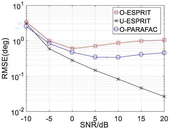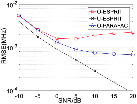 Secondly, the RMSE performance of the proposed algorithm with various SNR is depicted in Figure 4 and Figure 5, where M = 12 and L = 1000. For the performance comparison, the performance of traditional ESPRIT with one-bit measurement (marked with O-ESPRIT) and the traditional ESPRIT with un-quantified measurement (marked with U-ESPRIT) are added. RMSE with respect to DOA estimation and frequency estimation are shown in Figure 4 and Figure 5, respectively. It is seen that at low SNR regions (SNR < 0), there is no visible performance difference between the three algorithms. Notably, there is a performance gap between the algorithm with un-quantified measurements and that with one-bit measurement, this is because the one-bit measurement is lossy. As the SNR increases, the performance gap becomes larger. Another interesting finding is that when SNR is larger than a given threshold (SNR = 10), RMSE will not decrease with the increasing SNR. Besides, the proposed O-PARAFAC algorithm achieves better RMSE than O-ESPRIT, since the tensor structure has been exploited.