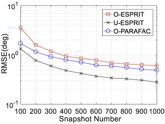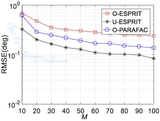 Figure 12, respectively, where M = 12 and SNR = 0 dB are considered. Similar to our previous findings, RMSE on DOA estimation and frequency estimation would improve with P increasing. In addition, the performance of O-PARAFAC is better than O-ESPRIT but worse than U-ESPRIT.