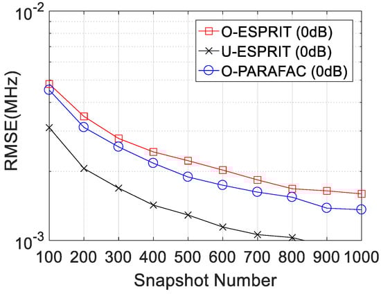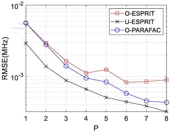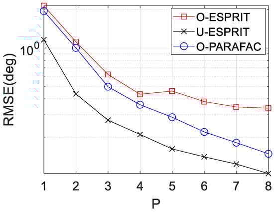 Finally, the RMSE curves with various delay P are depicted in Figure 11 and Figure 12, respectively, where M = 12 and SNR = 0 dB are considered. Similar to our previous findings, RMSE on DOA estimation and frequency estimation would improve with P increasing. In addition, the performance of O-PARAFAC is better than O-ESPRIT but worse than U-ESPRIT.