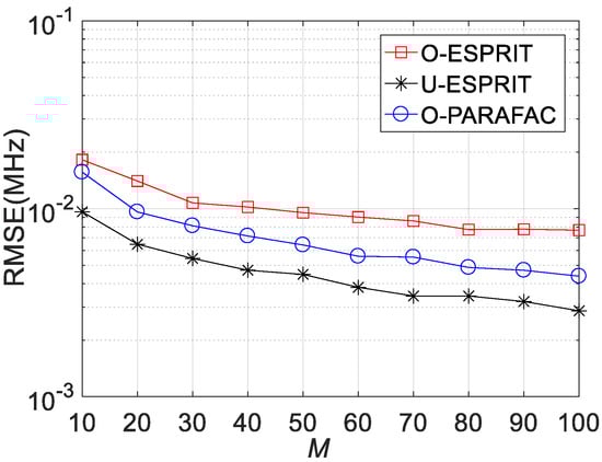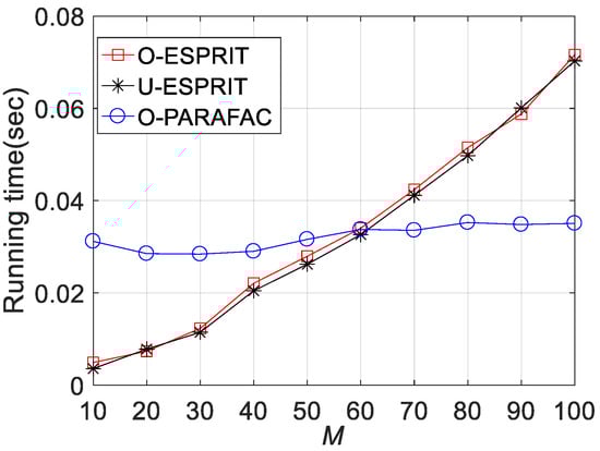 Fourthly, the RMSE performances versus sensor number M are depicted in Figure 8, Figure 9 and Figure 10, where L = 1000 and SNR = 0 dB. It is shown that estimation performance would improve with the increasing M. A similar observation can be seen that the performance corresponding to O-PARAFAC is between that of the O-ESPRIT and U-ESPRIT. In addition, one can observe that the proposed algorithm requires less calculation time then O-ESPRIT and U-ESPRIT when M is larger than 60, which implies that the proposed algorithms is much more efficient than the compared algorithms is the presence of massive antennas.