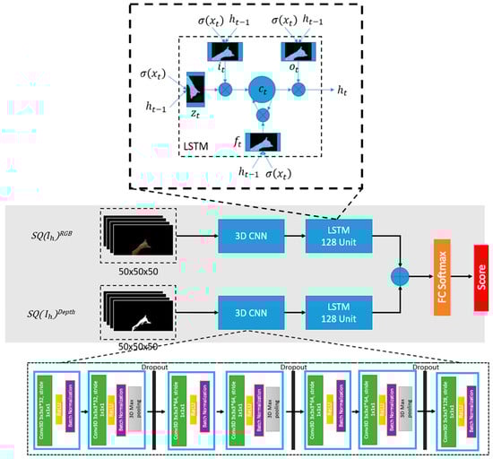 As shown in Figure 4, considering the above-discussed advantages of combining CNN and LSTM networks, the proposed multimodal architecture consist of 3DCNN layers, one stack LSTM layer and, a fully connected layer followed by the softmax layer. Batch normalization was utilized to allow the model to use much higher learning rates and less concerned about the initialization to accelerate the training process. The kernel size of each Conv3D layer is 3 × 3 × 3, the stride and padding are sizes of 1 × 1 × 1. The feature maps consist of four filter sizes such as 32, 64, 64 and 128, and double them up within each layer to increase the depth. Each Conv3D layer is followed by a batch normalization layer, a ReLU layer and a 3D Max Pooling layer with a pool size of 3 × 3 × 3. Features are extracted from the 3DCNN architecture then fed into the one stack of LSTM with 256 sizes of the unit. Several dropout layers were added in every section with the value of 0.5 and then computed the output probability result using the softmax layer.