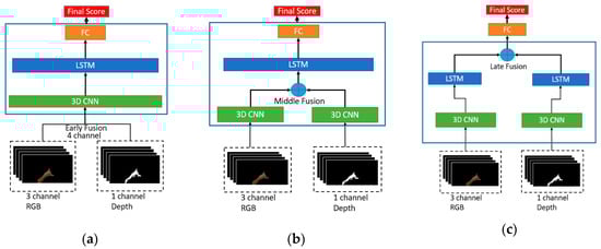 The proposed multimodal model architecture of 3DCNN + LSTM: (a) Early fusion multimodal; (b) Middle fusion multimodal; (c) Late fusion multimodal.