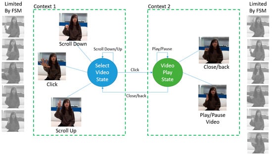 These works show that the Finite State Machine is one of the sophisticated methods that has been used for gesture recognition. One of it uses to model the trajectory of movements, for example, hand or finger to recognize the gestures [23,46]. These works give us the general idea if restriction or control on gestures in each state according to the model in the FSM combined with the deep learning approach of classification is approachable.