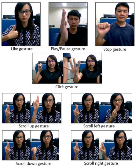 In order to test the proposed system in a real application, 8 gestures were selected from the 24 gestures dataset that collected previously. Those gestures selected based on the convenience uses in the application. The 8 gestures included 3 static and 5 dynamic gestures and Figure 9 represents the sample gesture types. The gestures as seen in Figure 10 are “like”, “play/Pause”, “stop” “click” “scroll up” “scroll down” “right swipe” and “left Swipe”.