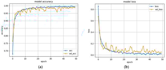 The performances of the late fusion 3DCNN+LSTM model with 8 gestures used in the system: (a) the model accuracy with the number of epochs; (b) the model loss against the number of epochs.