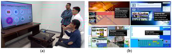 Showing the implementation of the proposed model in the Real-Time system: (a) People performing gestures to control the system; (b) The example content of the system. The following link is the system in action (http://video.minelab.tw/gesture/).