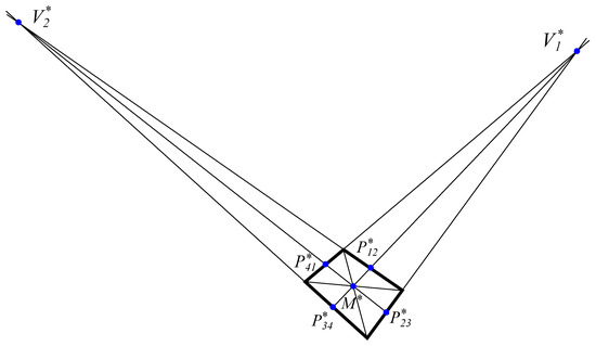 - In the triangle which is divided by the segment , a line that starts at and its intersection with the lines and is equidistant, in a way that a possible point in Front View can be obtained as shown in Figure 4.