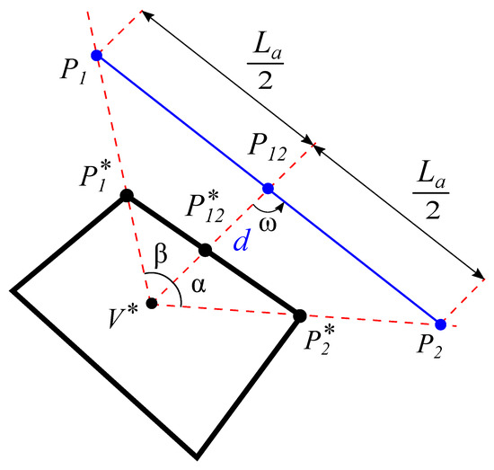 - The normal vector of the line in dihedral will be found by a rotation of the vector an angle reached using the trigonometric relation (1):The deduction of this expression is detailed in Appendix A, where is the angle between and ; and is the angle between and represented in the Figure 4 and expressed by the Equations (2) and (3).