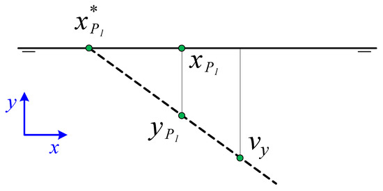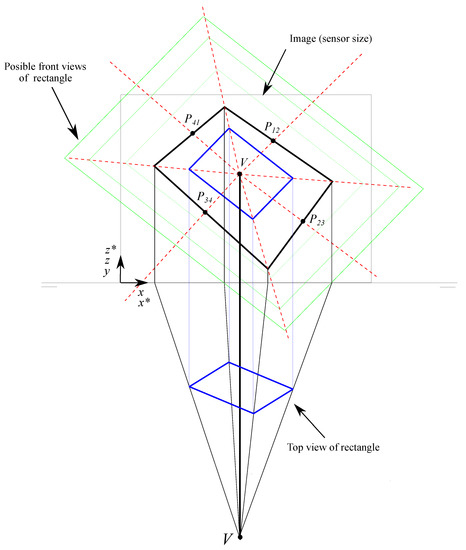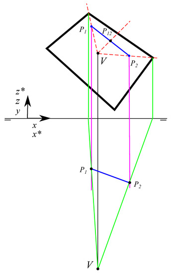 Figure 5. Obtaining the Top View from the Front View.To get the Top View of the rectangle from the hypothetical Front projection of the side it is possible to obtain its Top projection from the Top projection of V which is at a focal distance from the drawing plane. As an example, the y coordinate of the point will be obtained by the intersection of the line that joins V in the Top View with the point and the coordinate as shown in Figure 6 and in Equation (4). In the same way we proceed to obtain the y coordinate of the point .