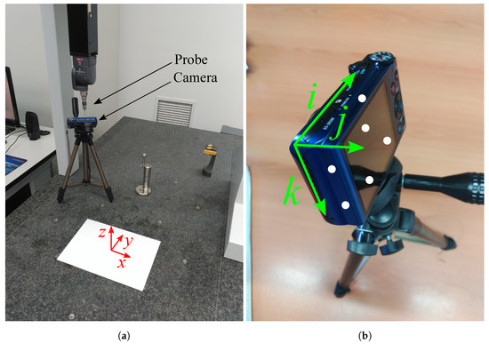 (a) Set-up used for the measurements of the position of the camera in rectangle coordinates through a CMM; (b) Points of the camera touched by the probe for the implementation of the 3-2-1 method [44].