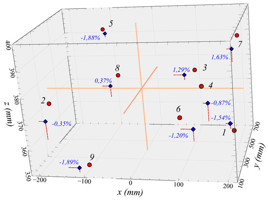As can be seen in Table 3 and Figure 10, the difference between the distance from the camera to the center of the folio, measured by the image analysis and by the CMM, is less than 2%. This indicates that, visually, very close accuracies of the actual distances can be achieved. Nevertheless, analyzing each coordinate, a very high error in the x coordinates is observed in some points. These errors occur when the camera is facing the folio, being the x-axis parallel to the sensor plane. In consequence, the vanishing points in this direction are far apart, and the intersection between the lines is more imprecise. As in these cases, the camera is located at a small value of the x coordinate, the influence of this value on the global error is reduced. This indicates a limitation since the method works best, the closer the vanishing points remain.