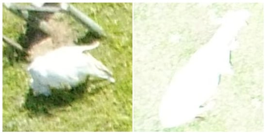 Unmanned aerial vehicles (UAVs), also known as unmanned aerial systems (UAS) and drones, are becoming commonplace in agriculture. New applications are being constantly proposed, both in the crop and livestock production chains [,]. In the specific case of cattle monitoring, there are a few applications in which UAVs can have immediate impact, including the estimation of the number of animals, monitoring of anomalous events (diseased animals, calf birth, etc.) and measurement of body traits. All of those applications have one step in common: before the extraction of more sophisticated information, the animals need to be detected in the images. The definition of the term “detection” will often depend on the approach being used. In this work, convolutional neural networks (CNNs) architectures are used as classifiers, which means that the term “detection” refers to the recognition that a given image block contains at least part of an animal. It is worth noting that there are other ways to detect animals, such as using algorithms that estimate bounding boxes around the objects [,], and algorithms that delineate the animal bodies through semantic segmentation [,]. The main shortcoming of the former is that each architecture has some conditions under which they tend to perform poorly (e.g., you only look once (YOLO) [] struggles with groups of small objects and to generalize aspect ratios), while the latter requires careful image annotation which can be very time-consuming. Because of those issues, they were not considered in this study.