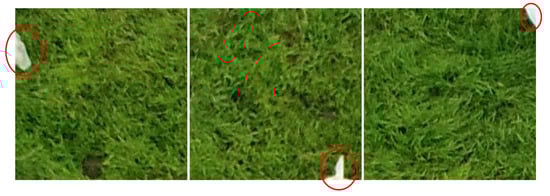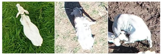 The drop in accuracy observed when the regular grid approach was adopted is almost exclusively due to many image blocks annotated as “cattle” having very few pixels actually associated with an animal (Figure 8). Because such blocks contain mostly background, it may be difficult for the model to learn the correct features associated with cattle during training—if the wrong features are learned, the potential for misclassifications rises considerably. The reverse problem occurs during the application of the model: since the background is so dominant, the number of pixels associated with animals may not be enough for proper detection. However, considering the amount of “cattle” blocks showing only a small fraction of the animals’ bodies (Figure 9), it is remarkable that some models were able to yield accuracies above 95%. It is also important to remark that errors of this kind are not very damaging: blocks with small animal parts will almost certainly have one or more neighboring blocks containing the remainder of the animal, in which case correct detection is more likely. Errors caused by missed small parts can be compensated by other image processing techniques, which can be used to refine the delineation of the animals. There are some approaches that tackle this problem explicitly, like region proposal networks [] and the concept of anchor boxes used in YOLO []. These alternative techniques will be investigated in future experiments.