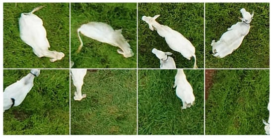 Two datasets were generated from the original images. In the first one, 224 × 224 pixel squares were associated to all animals in all images, carefully encompassing each individual. Animals at the edges of the images were only considered if at least 50% of their bodies were visible. While the targeted animal was always centered, there were cases in which image blocks included parts of other animals due to close proximity. A total of 8629 squares containing animals were selected; the same number of squares was randomly selected to represent the background. This dataset was generated with the objective of determining the best possible accuracy that can be achieved when all objects of interest are perfectly framed by the image blocks to be classified. In the second dataset, images were subdivided into image blocks using a regular grid with 224-pixel spacing both horizontally and vertically. This value was chosen because 224 × 224 pixels is the default input size for many of the CNNs tested in this work and, additionally, blocks of this size encompass almost perfectly most of the animals present in the images. Blocks were then labeled as “cattle” and “non-cattle”; to be labeled as “cattle”, a block should contain at least a few pixels that could be undoubtedly associated with an animal without having any other block (or the entire image) as reference. This criterion is subjective and susceptible to inter- and intra-rater inconsistencies [], but this was the most viable approach given the amount and characteristics of the images. A total of 14,489 image blocks were labeled as “cattle”; the number of “non-cattle” blocks was much higher but, in order to avoid problems associated with class imbalance, only 14,489 randomly selected “non-cattle” blocks were used in the experiments. Both image datasets were manually annotated by the same person. Some examples of “cattle” image blocks present in each dataset are shown in Figure 5.