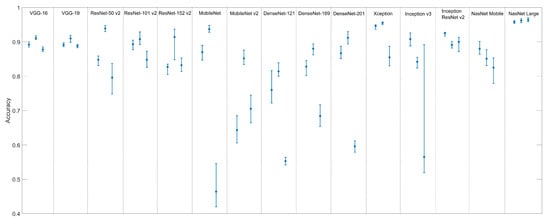 Range of accuracies obtained for each CNN architecture. The three bars associated to each architecture correspond to input sizes of 224 × 224 (left), 112 × 112 (middle) and 56 × 56 (right). The circle in each bar represents the average accuracy, and the bottom and top extremities represent the lowest and highest accuracies observed during the application of the 10-fold cross-validation.