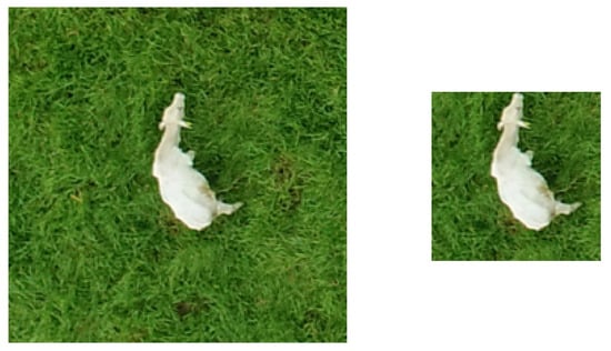 As expected, accuracies were lower when the regular grid was used. Interestingly, for 12 of the 15 models, the best results were achieved using the 112 × 112 input size. This indicates that the ideal GSD for cattle detection is 2 cm/pixel. At a first glance, this may seem counterintuitive, because higher resolutions tend to offer more information to be explored by the models. However, the way most CNNs architectures are designed (filter and convolution sizes), features related to cattle can be more effectively extracted at this GSD. As an added bonus, these results indicate that we could fly twice as high (thus covering a much larger area) without losing any accuracy. It is worth mentioning that another method for simulating different GSDs was considered, in which the entire image is downsampled and then the regular grid is applied, instead of first applying the grid and then downsampling the image blocks. The main difference between both approaches is that in the latter the relative area occupied by animals within each block is kept the same, while in the former the area occupied by the animals will decrease in the same proportion as the downsampling. In both cases, the number of pixels associated with the animals will be exactly the same, but in the approach adopted here the amount of background will be much lower (Figure 8). Some limited experiments were performed using the alternative approach, and a drop in accuracy was observed for all models but Inception v3, for which the accuracy was slightly better.