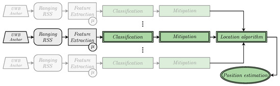 The present work addresses this deficiency by proposing a series of experiments in which different ML models for classification and mitigation, which are trained, validated, and tested with measurements captured in a given scenario, are evaluated in a different physical scenario. Figure 1 shows the block diagram of the proposed solution, where the green blocks indicate the tasks addressed in this work. It can be seen that, unlike in the previous work [5], the blocks corresponding to the Location Algorithm—considering the combination of the results coming from different anchors—and Position estimation are new contributions of this work.