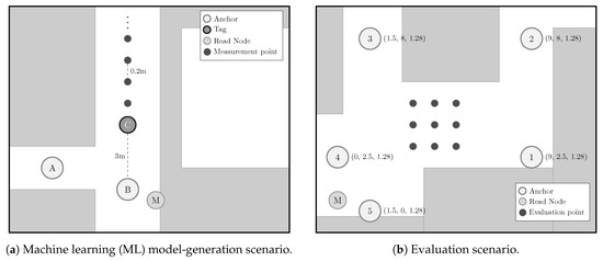 - NLOS detection and mitigation algorithms based on ML techniques were trained considering ranging and RSS values from a UWB measurement campaign carried out in the ML model-generation scenario (see Figure 2a), whereas those models were applied to data from another UWB measurement campaign carried out in a different scenario: The evaluation scenario (see Figure 2b).