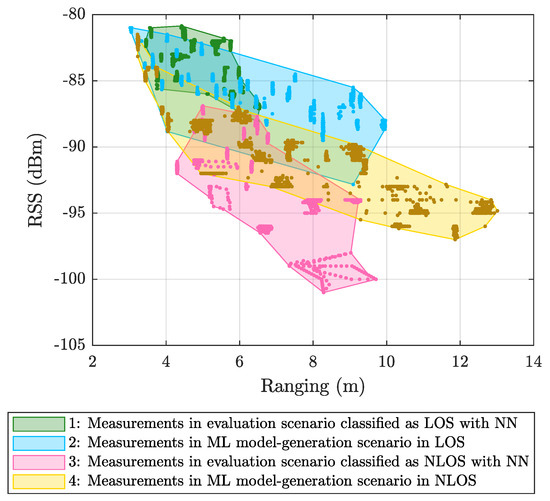Figure 3 shows RSS versus ranging values measured in the ML model-generation scenario and corresponding to LOS (blue) or NLOS (yellow) propagation conditions. Figure 3 also plots the values measured in the evaluation scenario after being classified as LOS (green) or NLOS (magenta) by the NN classifier. The superposition of the values from the two scenarios demonstrates that (1) the NN is able to distinguish correctly between LOS and NLOS, even though both scenarios are different, and (2) the relationship between RSS and ranging values is significantly different in both scenarios, especially in the case of NLOS.