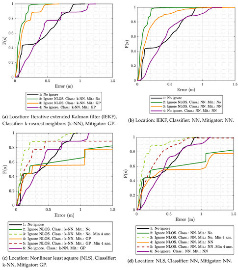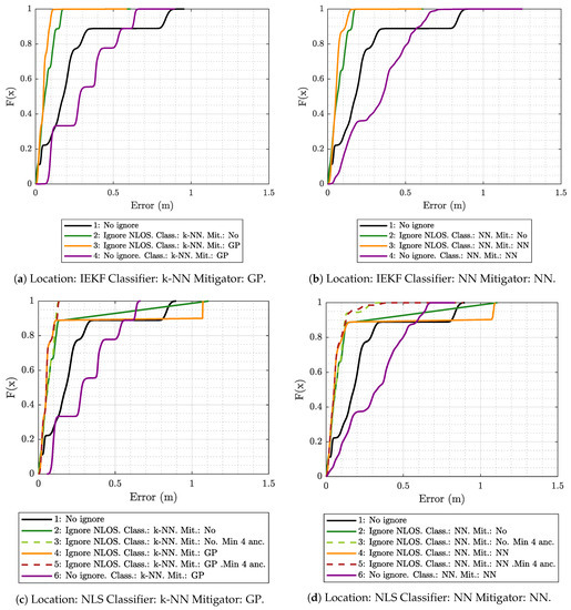 To analyze the effect of a different positioning algorithm, Figure 4c,d show the ECDF using the NLS-based algorithm to estimate the positions while considering k-NN/GP and NN, respectively. The main differences between these figures and the previous ones using IEKF are in configurations 2 (solid green) and 4 (solid orange), which correspond to the cases in which NLOS ranging values are ignored (and mitigated in the case of configuration 4).