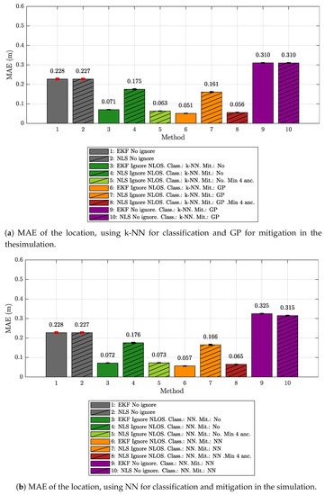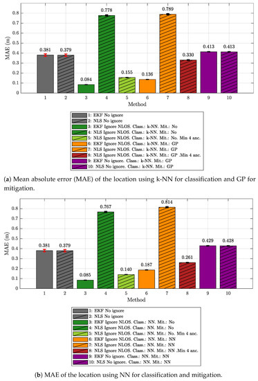 Figure 5a shows the results when k-NN is used for classification and GP for mitigation. The first configurations (1 and 2) correspond to the cases in which the location is carried out using all available measurements, without applying any type of filter or mitigation. It can be seen that the values corresponding to IEKF (label 1, gray) and NLS (label 2, crossed out, gray) are practically the same, around m. These configurations are the basis of the comparison, as they mark the expected error before applying the techniques proposed in this work.