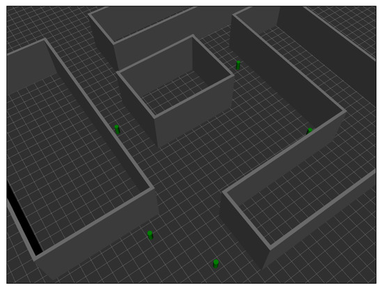 To do this, since it would be impossible to replicate a configuration of beacons in the ML model-generation scenario in the exactly same way as in the evaluation scenario, it was decided to carry out a simulation-based approach. This simulation is based on the UWB simulator described in [8] and developed by the authors. The simulator is built on the Gazebo simulation platform [33], a multi-platform software consisting of several components and focused on the virtual simulation of real physical environments. Five UWB anchors were placed in the same positions as in the evaluation scenario described in Section 2.2, shown in Figure 2b. The final model of the scenario is drawn in Figure 6.