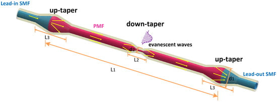 A part of uncoated SMF (SMF-28, Corning, New York, NY, USA) is over-fusion spliced with a piece of the PMF (PM15-1(06002)-3) by a commercial fusion splicer (FSM-100P, Fujikura, Tokyo, Japan). The splicing parameters are set up as follows: the overlap size is 100 μm, the arc discharge intensity is 400 bits and the taper discharge time is 150 ms. Secondly, another up taper is made in the same way as above. The middle of the PMF is positioned and tapered by arc discharge method, the arc parameters are set up as follows: the length of taper area is set as 310 μm, discharge intensity is 600 bit and the taper discharge time is 60 ms. The microscope images of down-taper and UDT structure are shown in Figure 5a,b, respectively. It can be clearly seen that a down-taper is located in the middle of the dual up tapers. For the down taper, the symmetric transitions are demonstrated with the length of , the shortest waist-diameter is = 30 μm. The outer diameters of the up taper and taper length are measured around 203 μm and 241.8 μm, respectively.