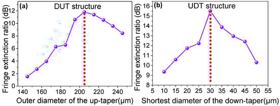 The relationship between (a) the diameter of the up taper and spectral fringe extinction ratio for DUT structure; (b) the diameter of the down taper and spectral fringe extinction ratio for UDT structure.