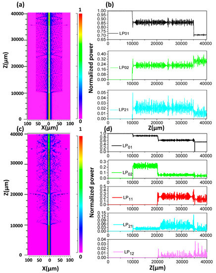 Compared with Figure 3b, the number of the cladding modes are increased. Figure 4 shows the normalized power of each mode when crossing in the DUT and UDT structures. For the DUT structure as shown in Figure 4a it can be seen that 70.70% of the total power still exists in mode, mode carries about 28.16% of total power and mode only occupies 1.14% of the total power.