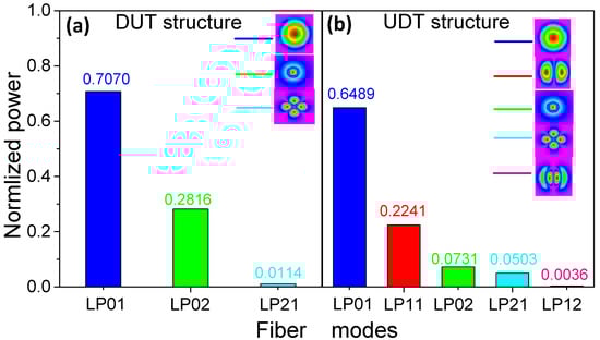 The normalized power of each mode crossing in the (a) DUT and (b) UDT structure.