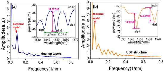 A dominant cladding mode and core mode are formed interference which can be considered. Such as the ones illustrated in Figure 6a, the transmission spectrum is formed after over-fusion splicing of PMF ( = 2.5 cm) and SMF. Three dips are formed in the spectrum, in detail, the free spectral range of two adjacent dips is 12.74 nm and 12.24 nm, respectively. The maximum extinction ratio of the interference fringes is about 12.677 dB. It can be seen from the FFT analysis in Figure 6a that there are a few peaks in the spatial spectrum, indicating that multiple modes are involved in the interference and the dominant cladding mode which corresponding frequency is 0.089 (1/nm). The transmission spectrum of the UDT structure and corresponding FFT spectrum are shown in Figure 6b. Compared to DUT structure, the number of individual cladding modes has changed obviously, and the corresponding frequency of dominant cladding mode is 0.044 (1/nm). Since the power of the core mode is further diffused into the cladding at the down taper area, the power corresponding to the mainly interference cladding modes have increased, the interference fringe extinction ratio of the two dips can reach to 14.903 dB and 14.037 dB, respectively. The UDT structure can be used to further increase the interference between core mode and dominant cladding modes.