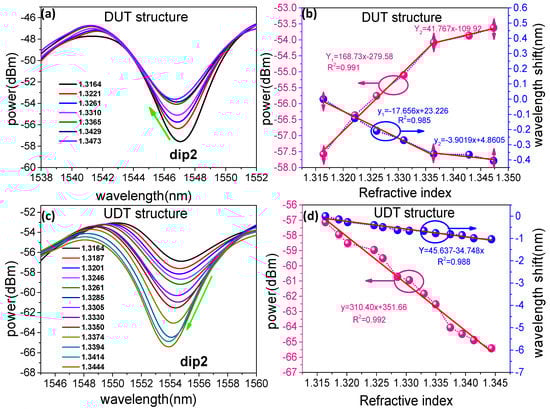 The experiment is conducted at room temperature (25 ± 0.2 °C). A comparison RI sensing experiment using DUT structure is carried out. The evolution of the transmission is shown in Figure 7a, the wavelength of dip2 shows blue shift when the RI increases and the intensity of fringe is increased. The wavelength of dip2 shifts against the RI and linear response are plotted as shown in Figure 7b, the experiment results show that a sensitivity of 168.73 dB/RIU when the liquid RI corresponds in the range of 1.3164–1.3473. However, the wavelength is only blue shifts by 0.405 nm in this range. The transmission spectrums of UDT structure with the varied surrounding RI are shown in Figure 7c, we can see that as the RI increases, the wavelength of dip2 shows blue shift and the intensity of fringe is decreased. The wavelength of dip2 shifts against the RI is plotted and linearly fitted in Figure 7d, the results show that a sensitivity of 310.40 dB/RIU from the resonance wavelength when the liquid RI corresponds in the range of 1.3320–1.3605. The wavelength did not change significantly and it drifts only ~1.035 nm in the range of the RI interval. The detection resolution is 6.8 times to the wavelength demodulation by using intensity demodulation. Compared with the RI experiment results of the DUT structure which are shown in Figure 7a, the RI sensitivity of the UDT structure on the intensity demodulation is increased 83.96% with better linearity.