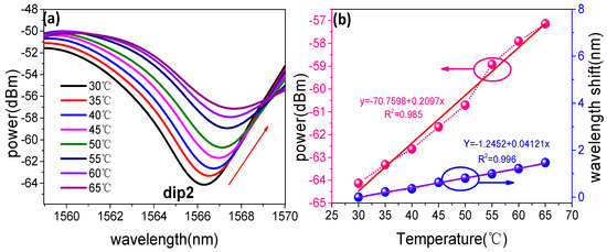 The change of ambient temperature can be considered as measuring RI errors, and the temperature sensitivity is also measured within the range of 30–65 °C. As shown in Figure 8a, we can see that the wavelength of dip shows a red shift as the temperature increases, and meanwhile the intensity of fringe is increased. A sensitivity of 0.20970 dB/°C and 41.21 pm/°C in the range of 30–65 °C as presented in Figure 8b. The resolution of the sensor with the RI sensitivity is 3.22 × 10−5 RIU. The experimental measurement error is 0.01351% which is 0.04194 dB/RIU light intensity crosstalk in cross sensing experiment for the environment temperature change is 0.2 °C. Based on the above experimental results, the proposed sensing structure has different sensitivity to RI and temperature. The change in wavelength drift and light intensity can be expressed as the following equations [36]: