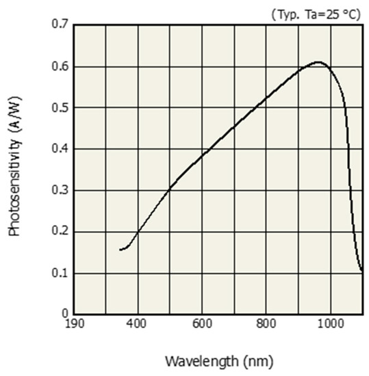 - Photodiode, S. S1337 Series Technical Data Sheet; Hamamatsu Photonics KK, Solid State Division: Hamamatsu City, Japan, 2001. [Google Scholar]