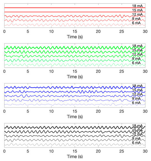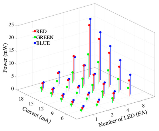 | Number of LED | Color | Radiant Flux According to the Current (mW) | ||||