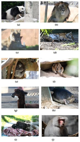 Data collection from 10 zoo animals, (a) giant panda, (b) African lion, (c) African lioness, (d) Sumatran tiger, (e) koala, (f) red kangaroo, (g) alpaca, (h) penguin, (i) Sumatran orangutan, and (j) Hamadryas baboon.
