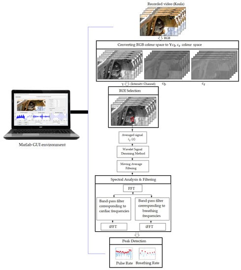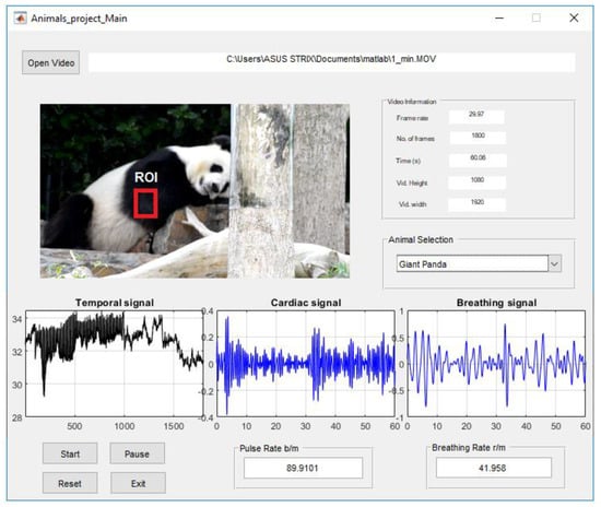 A GUI model was implemented in the MATLAB environment R2018b (MathWorks, NSW, Australia) with the Microsoft Windows 10 operating system to allow the user to load video data, manually select the animal according to its cardiopulmonary range, select the ROI where the cardiopulmonary signal was most apparent, and execute the algorithm. The experimental proposed graphical user interface (GUI) provides an easy tool to see video information and the selected ROI and enable the user to recognize the cardiopulmonary readings. Figure 3 shows the GUI main panel of the experimental proposed image analysing system.