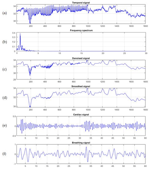 The results from the giant panda (Ailuropoda melanoleuca) showed that motion caused by cardiopulmonary activity could be used to extract the cardiopulmonary signal on the selected ROI as shown in Figure 3. Thus, both PR and BR could be estimated by applying a spectral analysis method based on FFT on the averaged intensity signal . The temporal signal and frequency spectrum of the  are shown in Figure 4a,b. The denoised signal using wavelet Daubechies is shown in Figure 4c and the smoothed signal using moving average filter with span equal to 5 is shown in Figure 4d. Since the Panda’s physiological parameters falls within a frequency band between 1.167 and 2 Hz for the cardiac signal and 0.333 to 0.667 Hz for the breathing signal [], we used band-pass filters with selected frequencies of 1.17 to 2 Hz and 0.33 to 0.67 Hz, corresponding to 70–120 b/m and 20–40 r/m, respectively, followed by inverse FFT to obtain both the cardiac signal and breathing signal as shown in Figure 4e,f, respectively.