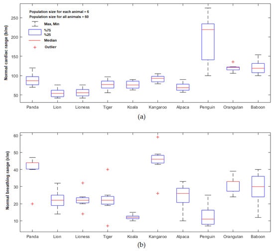 Box plots show the minimum, maximum, 25–75th percentile and median value of the cardiopulmonary range obtained from 10 zoo animals for (a) PR results, and (b) BR results.