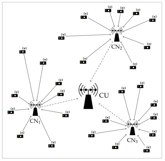 To further enhance the performance of the system, we now consider an extension of the previous setup with K data CNs, each one also equipped with N antennas. Each of them is responsible for collecting the information from a subset of single-antenna sensors for later retransmitting it to a CU, with . Thereby, we have a two-hop communication system, as illustrated in Figure 1. Such multi-hop scheme is largely exploited in the literature [39,41] and in standards such as LTE-M [20,48]. In this work, we focus on the communication in the first hop (solid line) and leave the second stage (dashed line) for further studies.