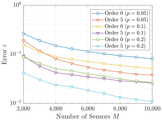 Following the previous discussion, we compare the different approaches for the the single-resource scenario only. In particular, we present the error in Equation (48) that each approach attains w.r.t. the number of sensors M. This is shown in Figure 6 and Figure 7. In the latter, the error is also depicted for different values of the activity factor p. This way, we can highlight the robustness of our proposal against the probability p. To avoid redundancy, in Figure 7, only orders 0 and 5 are shown.