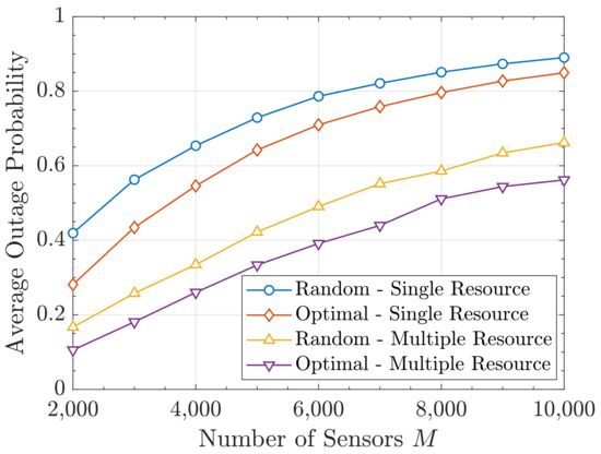 We first plot the average outage probability from Equation (44) obtained with both allocation strategies when changing M and p. This is depicted in Figure 8 and Figure 9, respectively. It can be seen that a substantial improvement is obtained with our proposal. In turn, the multiple-resource yields lower as the activity is reduced and more degrees of freedom (i.e., colors) are available. Note that the resource allocation is always done with the Gram–Charlier approximation of order 5 and that the resulting probability values are computed using the characteristic function method.