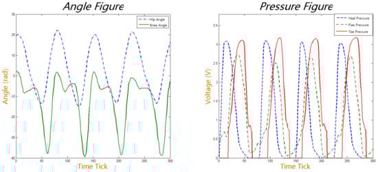 Finally, we obtained angle information from the knee and hip joints and FSRs data from the feet with 50 Hz sampling frequency. One segmentation of angle information of the hip and knee joints and FSRs of the foot are shown in Figure 3.